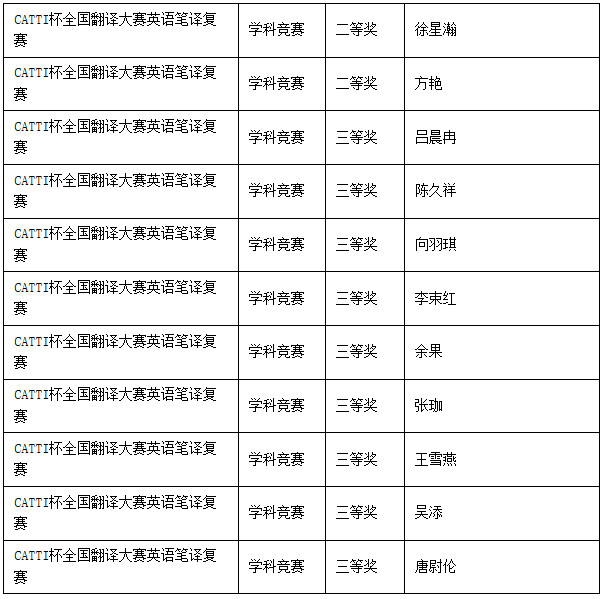 我校全校学生积极参与,外语学院的本科生和研究生是主力军,其他学院的同学也热烈响应,我校参与大赛学生总人数达到80人以上,并取得了不俗的成绩。其中复赛二等奖2名,三等奖9名;决赛二等奖1名,三等奖3名。
