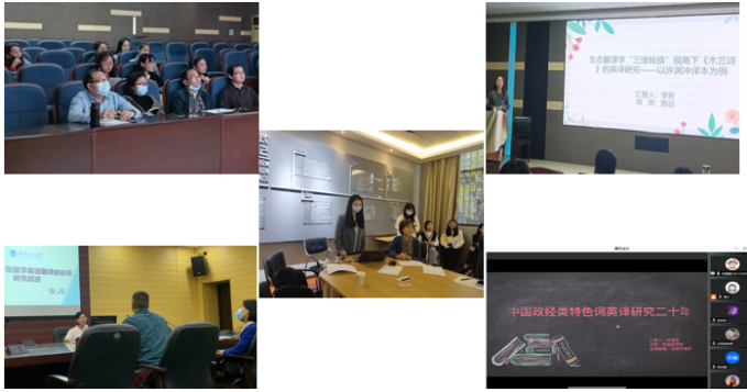 研究生基于前期课程学习和研究基础,运用文学地理学、女性主义、功能语言学、概化理论等语言文学领域前沿理论,以经典文学作品、政府工作报告、多模态文本等为研究对象,从不同的视角解读不同题材的语篇和话语;同时,还运用阐释学理论、生态翻译学理论、文化翻译观等翻译学领域前沿理论,以科技翻译、外宣翻译、散文翻译、广告翻译、儿童读本翻译等为研究对象,展开多元主题研究。大家以PPT形式结合先行研究、研究目的、研究内容和研究成果进行阐述,并对研究进展和阶段性成果予以汇报。评议老师们从选题范围的限定、研究方法的选取、理论与研究对象的适配度、PPT制作的要点等方面提出诸多建设性建议与批判性意见。