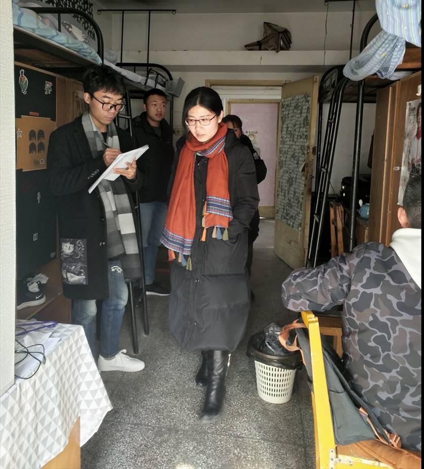 2018年1月9日中午,外语学院党委副书记赵春阳带领各年级辅导员、学生班主任、各班级生活委员对学生宿舍的用电安全及宿舍卫生严格检查,提醒学生冬季寝室用电安全,告诫学生寒假期间注意安全。