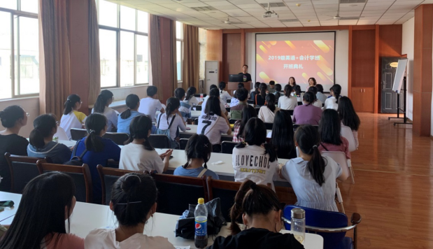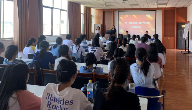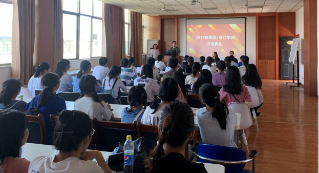 本网讯(通讯员王玮瑾)9月20日,2019级“英语+会计学”双专业班开班典礼在文科楼505举行。管理学院会计系主任许慧、副主任蒋瑜峰、“英语+会计学”双专业外语学院负责人王婉华、管理学院2019级辅导员王海澎出席典礼。